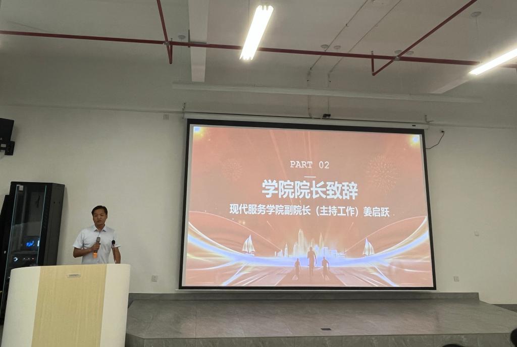 大会在庄严的国歌声中拉开帷幕。首先,现代服务学院副院长(主持工作)负责人代表学院致欢迎辞。他满含热忱,向全体2025级新生表示最热烈的欢迎。随后,他详细介绍了学院的发展历程与学科优势,并以师长的身份深情寄语新生,希望同学们能尽快完成角色转换,珍惜大学时光,夯实专业基础,锤炼过硬本领。