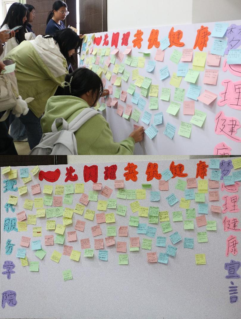 本次活动旨在提升大学生对于心理健康的认知,更为大家提供了一个交流与分享的平台,共同探讨如何在快节奏的生活中守护心灵绿洲。曾征不仅积极倡导自我心理健康的关注,还鼓励大家将这份关怀延伸至他人,共同营造一个温馨和谐的心理环境。讲座中,曾征紧扣学生关注的热点话题,运用视频教学这一生动形式,打开了学生们的心扉。同学们纷纷主动分享自己在日常生活中遇到的积极经历,欢声笑语充盈着整个教室。借此良机,曾征引导同学们以笔为媒,记录下自己的闪光点,用正面的语言为自己加油打气,并在“心理健康宣言留言板”上郑重写下对未来心理健康生活的美好憧憬与承诺。