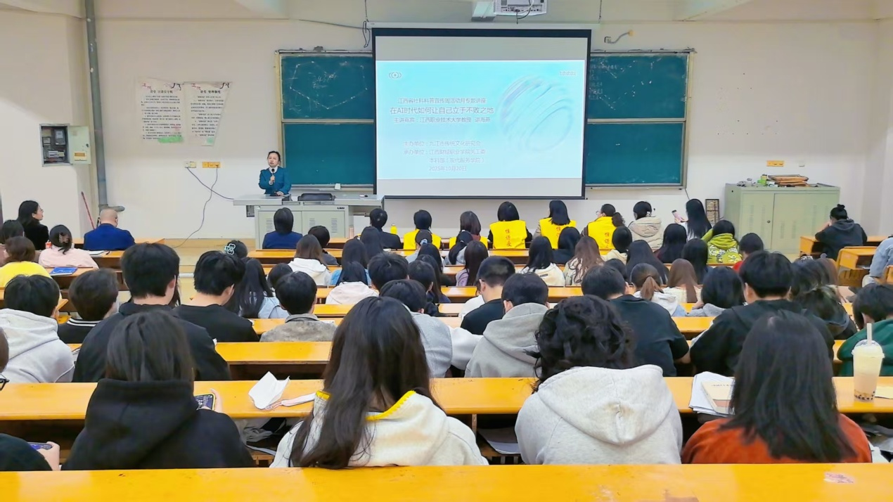 人工智能浪潮奔涌而来,如何在技术革新的洪流中锚定自身价值,构筑不可替代的竞争力,是每一名青年大学生需要面对的新课题。2025年10月20日,一场以《在AI时代如何让自己立于不败之地》为主题的专题讲座在浔阳校区综合楼阶梯教室六成功举办。本次活动由九江市传统文化研究会主办,校关工委与本科部(现代服务学院)承办,特邀江西职业技术大学谌海燕教授担任主讲,为现场近200 名学子带来了一场启迪心智的思想盛宴。